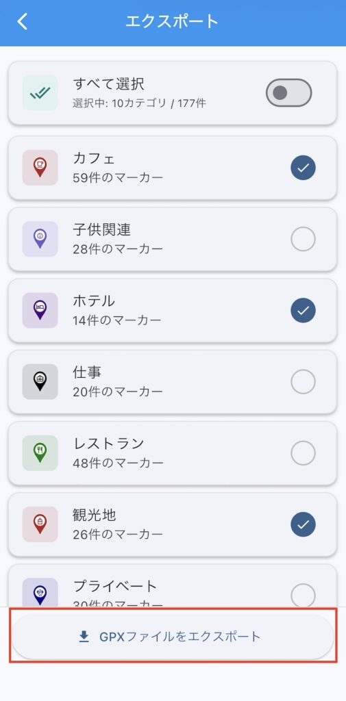 エクスポートしたいカテゴリを選択のうえ、「GPXファイルをエクスポート」をクリックします。