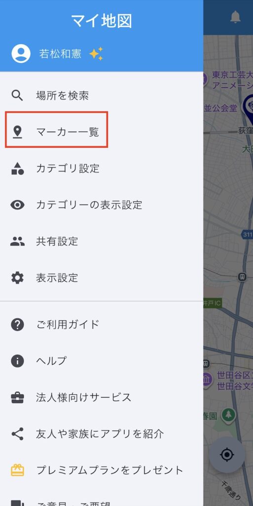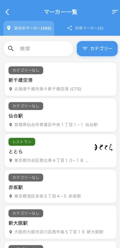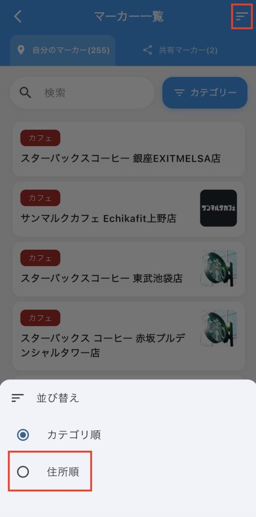 マーカー一覧は住所の都道府県順に並べ替えることができます。